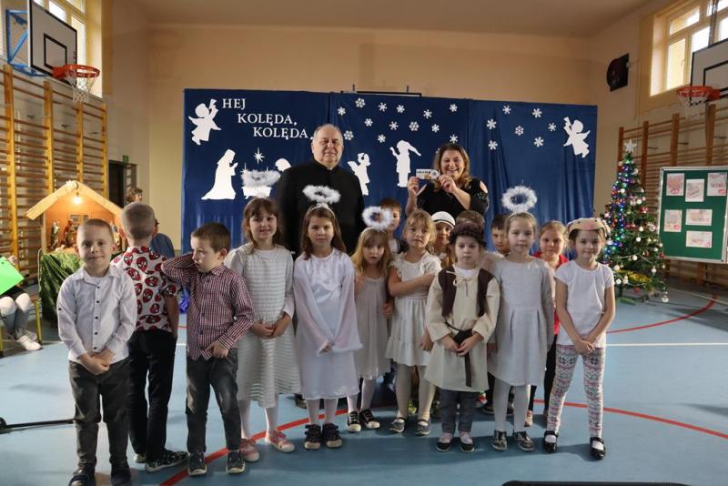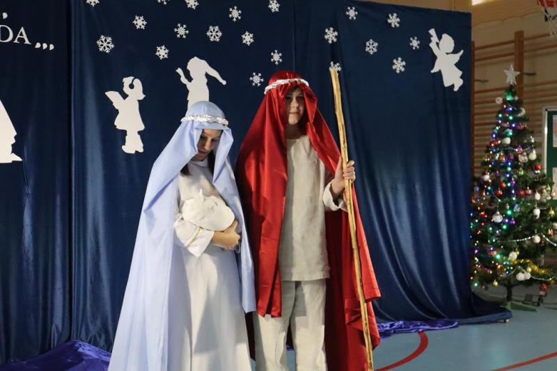 Podczas tego świątecznego spotkania klasa II b i IVa przedstawiły scenkę misyjną opowiadając o problemach dzieci w Kolumbii. W tym roku Ogólnopolska Akcja Kolędników Misyjnych wspiera duchowo – przez modlitwę, jak też materialnie – przez ofiarę złożoną do skarbonki dzieci z Kolumbii. Boże Narodzenie to urodziny naszego Pana i Zbawiciela. Nie zgubmy tego, co najważniejsze – Bożego Dzieciątka, ale nie zapomnijmy także o drugim człowieku.