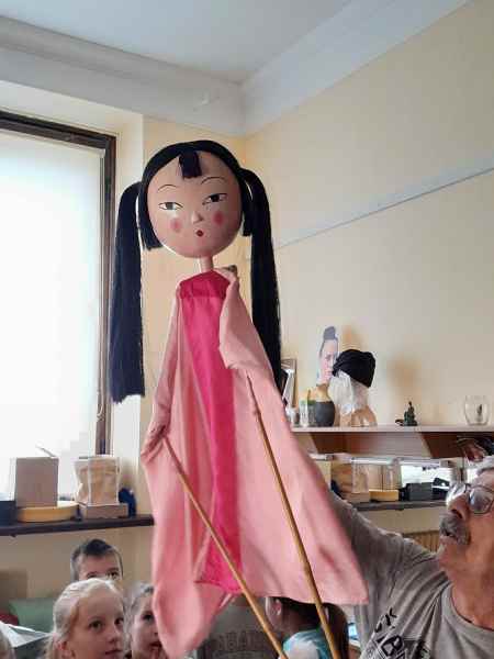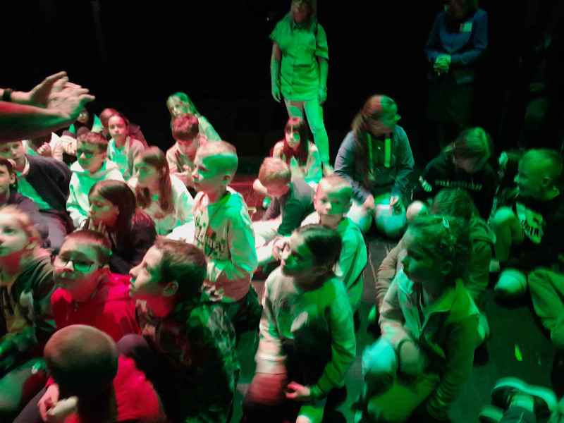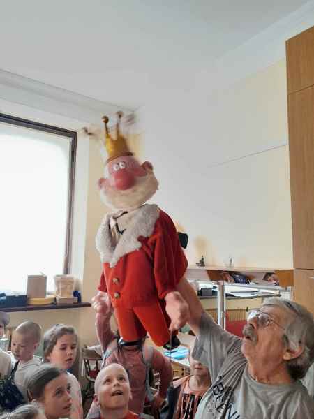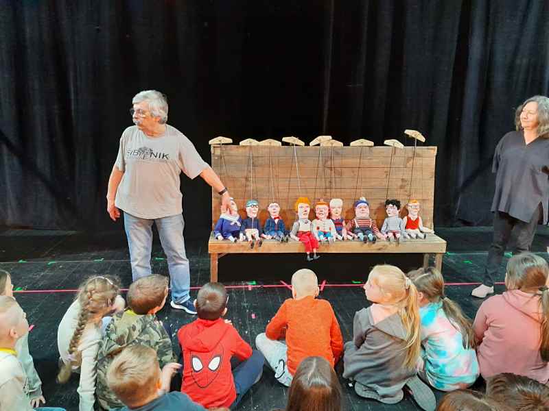 Następnie wypatrywaliśmy wysokiej wieży Pałacu Kultury. Tam, w Teatrze „Lalka”, oglądaliśmy spektakl „Wakacje Mikołajka”. Oswajaliśmy magię teatru, poznając jego kulisy. Okazało się, że teatr jak spodnie ma kieszeń, tyle, że z magazynem rekwizytów. Poznaliśmy pracę ludzi związanych z teatrem: oświetleniowca, scenografa, suflera. Nasze serca skradły panie szyjące stroje dla lalek jak i dla aktorów. Podziwialiśmy piękno kukiełek, marionetek, jawajek i kunszt animujących je aktorów.