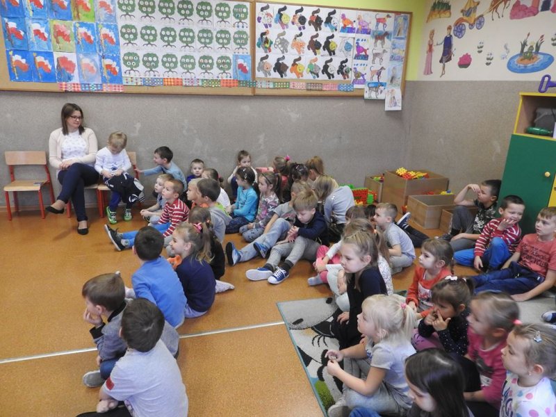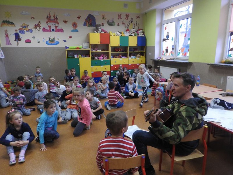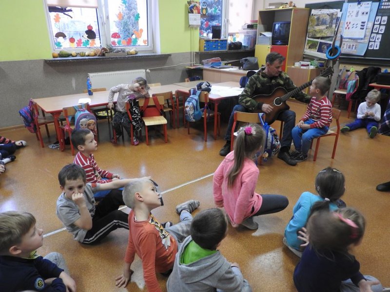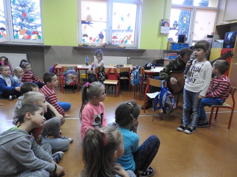 Następnie przy akompaniamencie pana Janusza Urbankowskiego dzieci z oddziałów przedszkolnych wraz z nauczycielami śpiewały wybrane pieśni patriotyczne, co sprawiało im wielką radość. Z pewnością wszyscy będą wspominać to spotkanie jako wielką lekcję patriotyzmu. Dziękujemy panu Januszowi za przybycie i poświęcony czas.