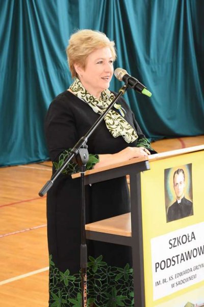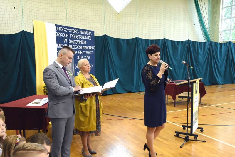 Druga część uroczystości miała miejsce w Gminnej Hali Sportowej. Przybyli na nią, m.in.: JE ks. bp Piotr Sawczuk, ks. kan. Marek Matusik, ks. kan. Stanisław Wojciechowski (wielki orędownik nadania imienia bł. ks. E. Grzymały- najpierw- Gimnazjum, a teraz – Szkole Podstawowej), ks. prob. Antoni Kunicki, p. Waldemar Cyran- Wójt Gminy Sadowne, p. Marcin Gręda- zastępca Wójta Gminy Sadowne, posłowie RP: p. Kamila Gasiuk- Pihowicz i p. Czesław Mroczek, p. Marcin Górski- przedstawiciel p. senator Marii Koc, p. Dorota Skrzypek- Pierwszy Mazowiecki Wicekurator Oświaty, p. Elżbieta Lanc- Członek Zarządu Województwa Mazowieckiego, p. Marek Renik- zastępca Starosty Powiatu Węgrowskiego, dyrektorzy szkół znajdujących się na terenie naszej gminy, przedstawiciele Rady Gminy Sadowne i Urzędu Gminy Sadowne, przedstawiciele policji, straży oraz nadleśnictwa, przedstawiciele różnych kół gminnych, dyrektorzy gminnych organizacji, opiekunowie kapliczki i miejsca urodzin bł. ks. E. Grzymały (Państwo Marianna i Tadeusz Kalbarczykowie) oraz kuzynka patrona naszej szkoły- p. Elżbieta Leśniak…