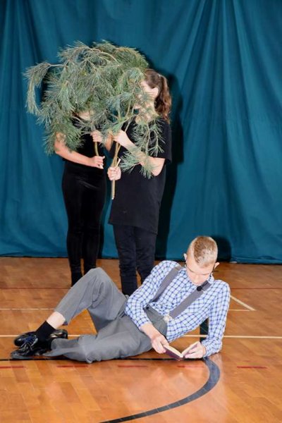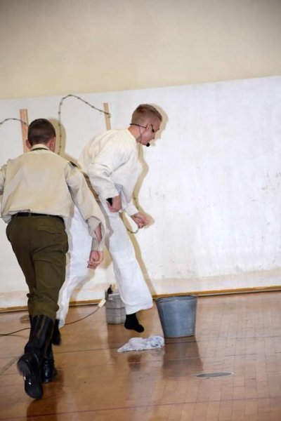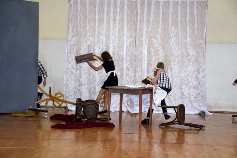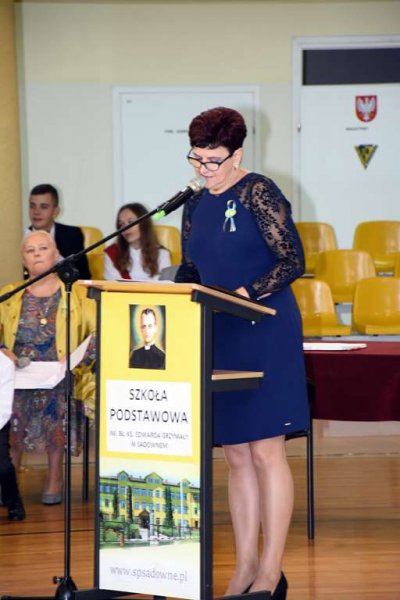 Tu odbyły się kolejno: powitanie gości i wszystkich zebranych na sali, wprowadzenie pocztów sztandarowych, przemówienie p. dyr. Małgorzaty Koroś i przedstawienie przez nią sylwetki oraz tragicznych losów bł. ks. E. Grzymały, przekazanie- przez rodziców- sztandaru Szkoły Podstawowej w Sadownem Dyrektorowi Szkoły, a następnie Szkolnemu Pocztowi Sztandarowemu, prezentacja sztandaru (projekt- p. Sławomir Akonom), ślubowanie uczniów na sztandar, wbicie pamiątkowych gwoździ przez gości i sponsorów, odsłonięcie i poświęcenie pamiątkowej ściany dedykowanej naszemu patronowi, przemówienia niektórych gości oraz spektakl teatralny przygotowany przez uczniów naszej szkoły pod kierownictwem p. Doroty Gałązki (scenariusz i reżyseria) oraz p. Anny Gierej (scenografia i niemal wszystkie dekoracje).