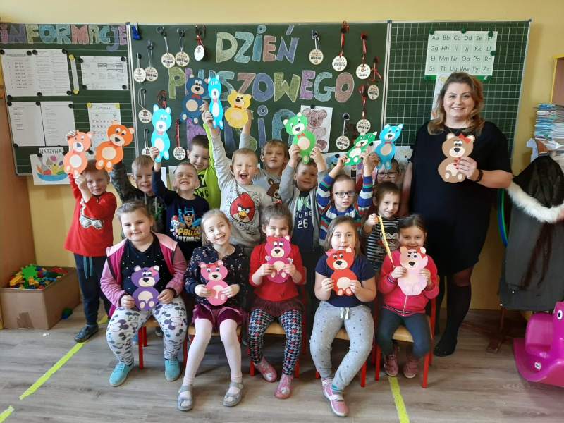 Wszystkie misie – małe i duże, bure i kolorowe obchodzą swoje święto 25 listopada czyli Światowy Dzień Pluszowego Misia. Mimo coraz nowocześniejszych i atrakcyjniejszych zabawek, moda na misie nie przemija. Dzieci z oddziałów przedszkolnych zostały zaproszone do wspólnej zabawy z misiem. Poznały historię Święta Pluszowego Misia, wspólnie bawiły się przy piosenkach. Dla dzieci w tym dniu przygotowane było wiele atrakcji: zabawy ruchowe, plastyczne, misiowe tańce. Ten dzień w przedszkolu był pełen uśmiechu, radości oraz wspólnej zabawy.