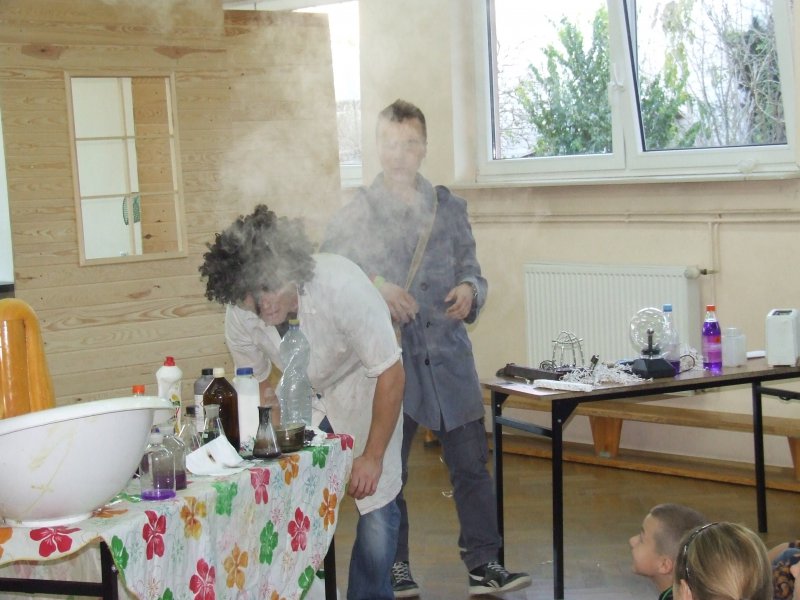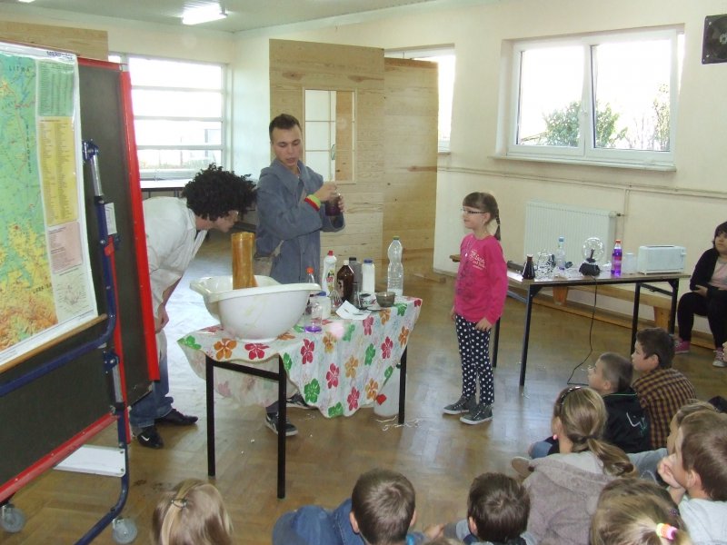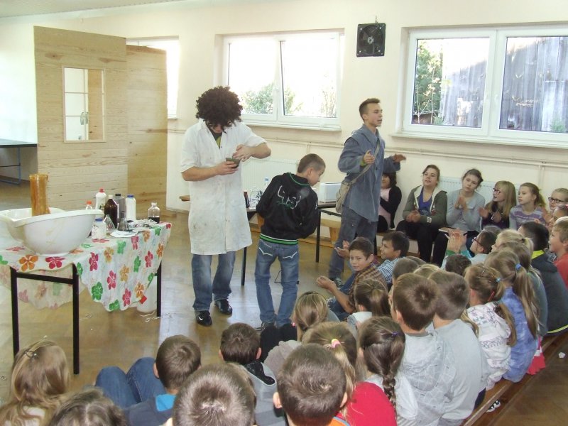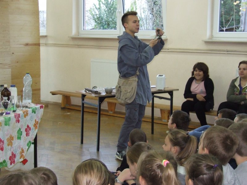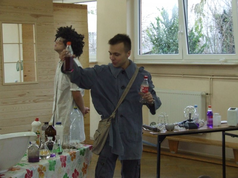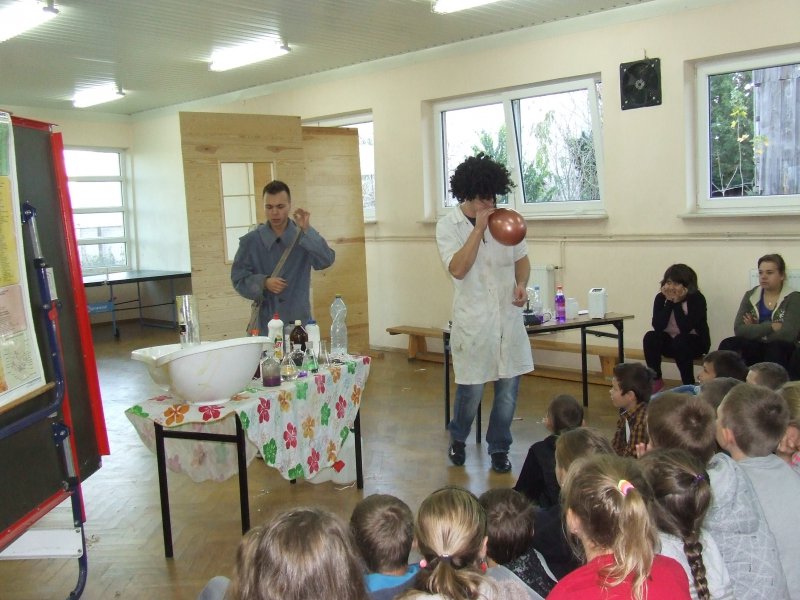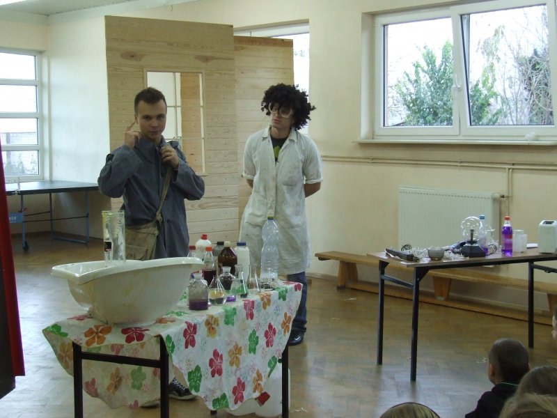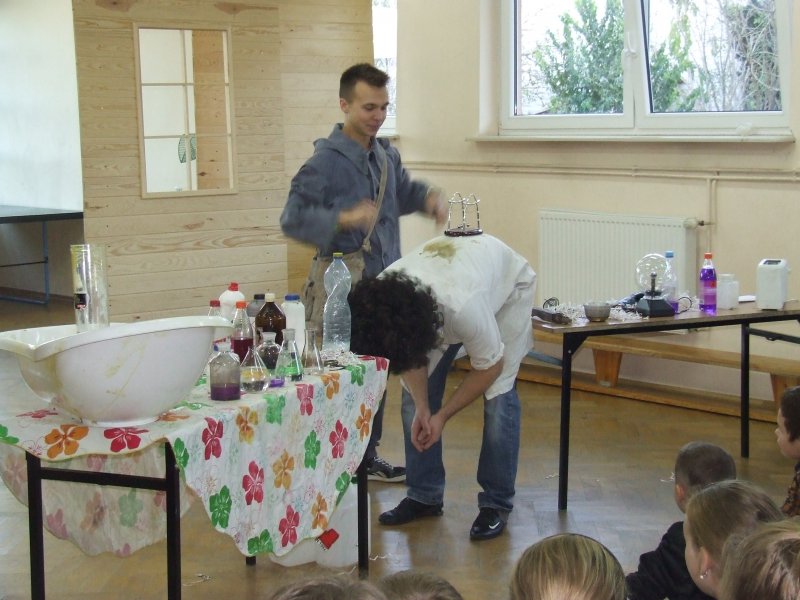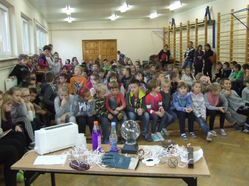 24 września naszą szkołę odwiedziła grupa „Zelektryzowani”. Stanowią ją dwaj panowie: Krzychu- podróżnik i Albercik-nieco ekscentryczny i lekko oszalały alchemik naukowiec. Celem ich wystąpienia było przekazanie uczniom wiedzy, którą zebrali podczas wielu wypraw w najdalsze zakątki świata. Naukowcy pokazywali różnorodne doświadczenia, które wprawiały w zachwyt i osłupienie. Widownia miała okazję sprawdzić na jakiej zasadzie działa kompas, jak czytać mapę, utrwalali kierunki geograficzne, sprawdzali jak działa pole elektrostatyczne i magnetyczne. Szaleni badacze próbowali również zbudować perpetuum mobile oraz mini silnik odrzutowy przy pomocy przedmiotów codziennego użytku, stworzyć zegar jodowy, wyhodowali zwierzątko dla Albercika i wiele, wiele innych. Uczniowie byli zaangażowani, bardzo chętnie uczestniczyli w pokazach, wielu z nich na pewno miało ochotę zamienić się miejscami z naukowcami. Zajęcia –lekko humorystyczne aczkolwiek bardzo pouczające sprawiły ,że uczniowie z pewnością zechcą pogłębić tajniki wiedzy fizyki i chemii. Takie „żywe lekcje przyrody”, w ściśle kontrolowanych warunkach ,stanowią fantastyczny element wzbogacający zajęcia dydaktyczne.