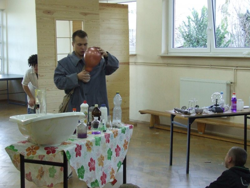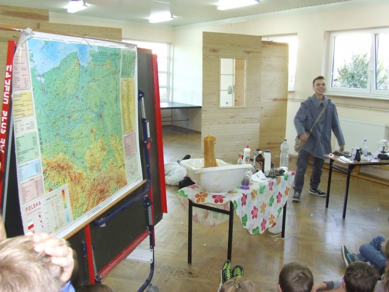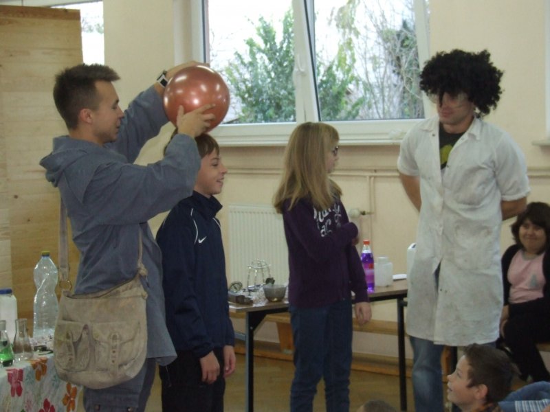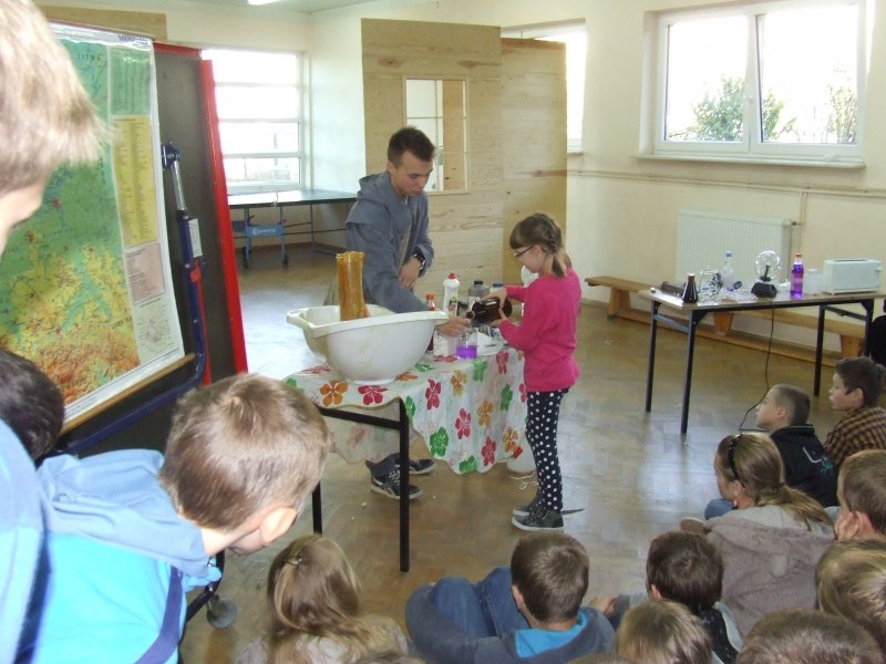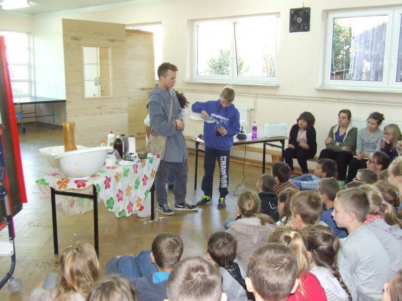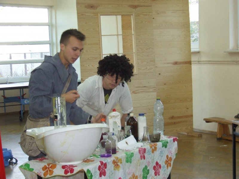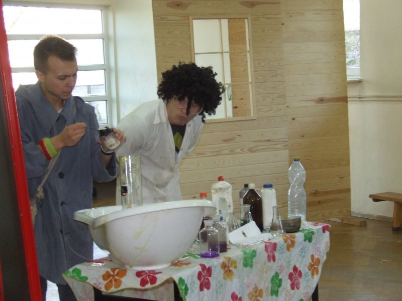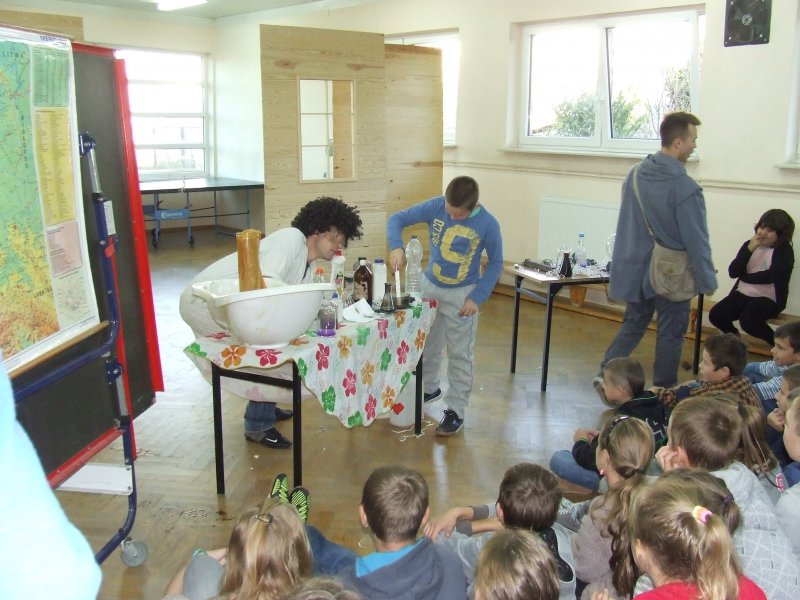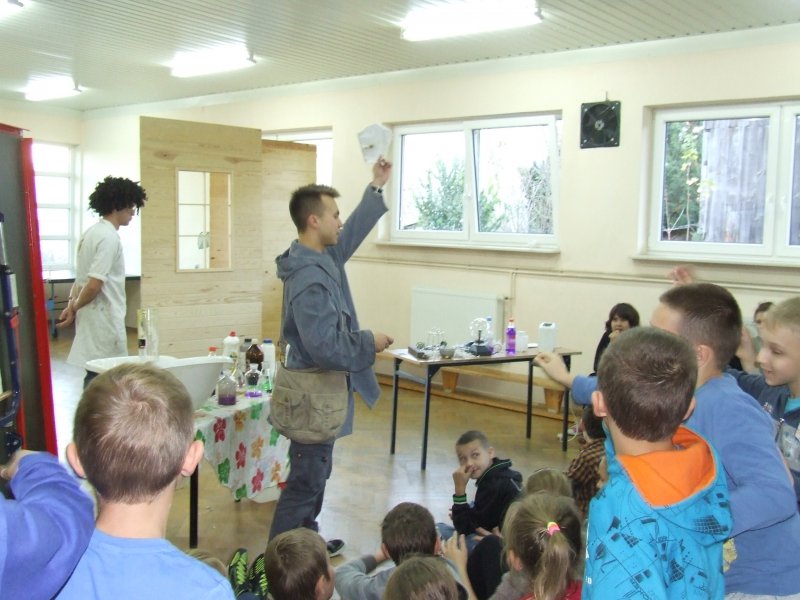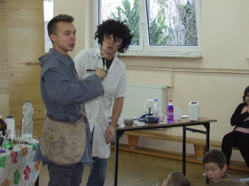 24 września naszą szkołę odwiedziła grupa „Zelektryzowani”. Stanowią ją dwaj panowie: Krzychu- podróżnik i Albercik-nieco ekscentryczny i lekko oszalały alchemik naukowiec. Celem ich wystąpienia było przekazanie uczniom wiedzy, którą zebrali podczas wielu wypraw w najdalsze zakątki świata. Naukowcy pokazywali różnorodne doświadczenia, które wprawiały w zachwyt i osłupienie. Widownia miała okazję sprawdzić na jakiej zasadzie działa kompas, jak czytać mapę, utrwalali kierunki geograficzne, sprawdzali jak działa pole elektrostatyczne i magnetyczne. Szaleni badacze próbowali również zbudować perpetuum mobile oraz mini silnik odrzutowy przy pomocy przedmiotów codziennego użytku, stworzyć zegar jodowy, wyhodowali zwierzątko dla Albercika i wiele, wiele innych. Uczniowie byli zaangażowani, bardzo chętnie uczestniczyli w pokazach, wielu z nich na pewno miało ochotę zamienić się miejscami z naukowcami. Zajęcia –lekko humorystyczne aczkolwiek bardzo pouczające sprawiły ,że uczniowie z pewnością zechcą pogłębić tajniki wiedzy fizyki i chemii. Takie „żywe lekcje przyrody”, w ściśle kontrolowanych warunkach ,stanowią fantastyczny element wzbogacający zajęcia dydaktyczne.