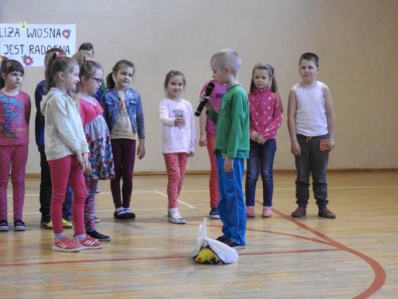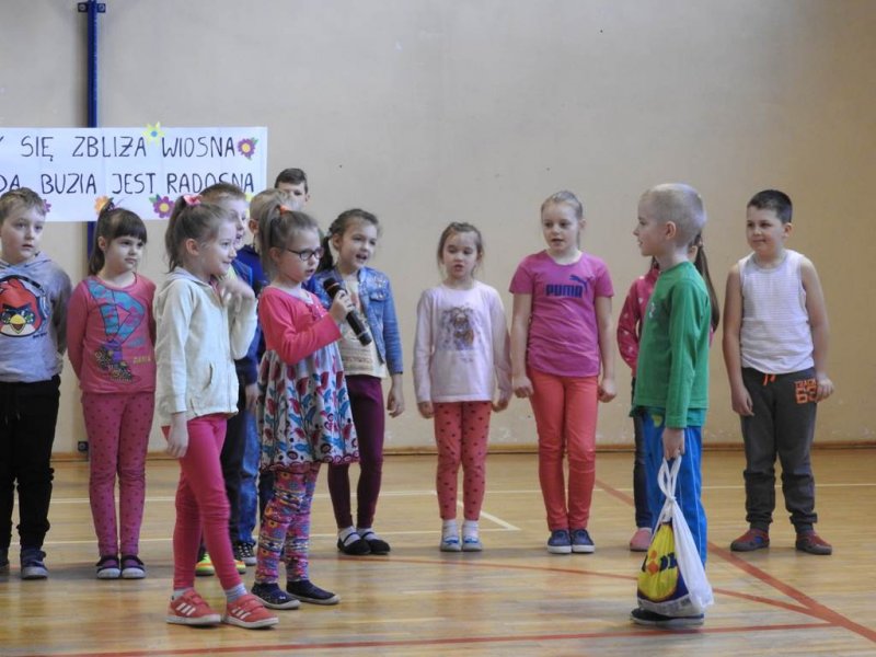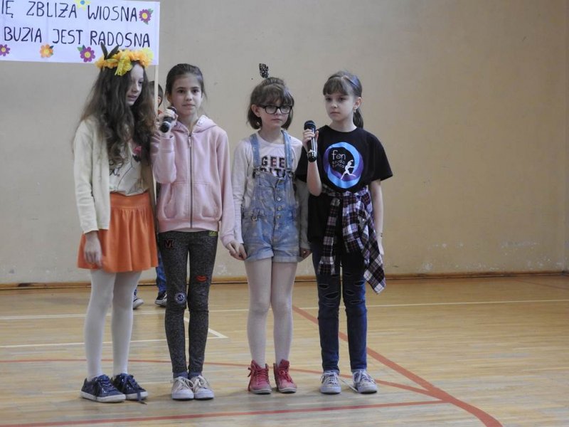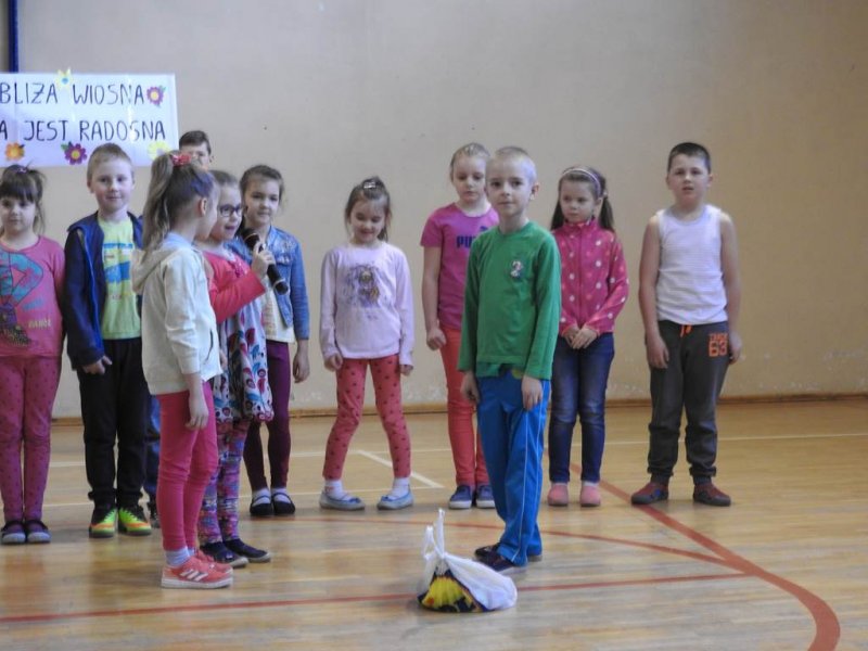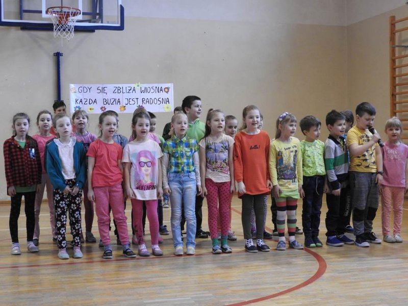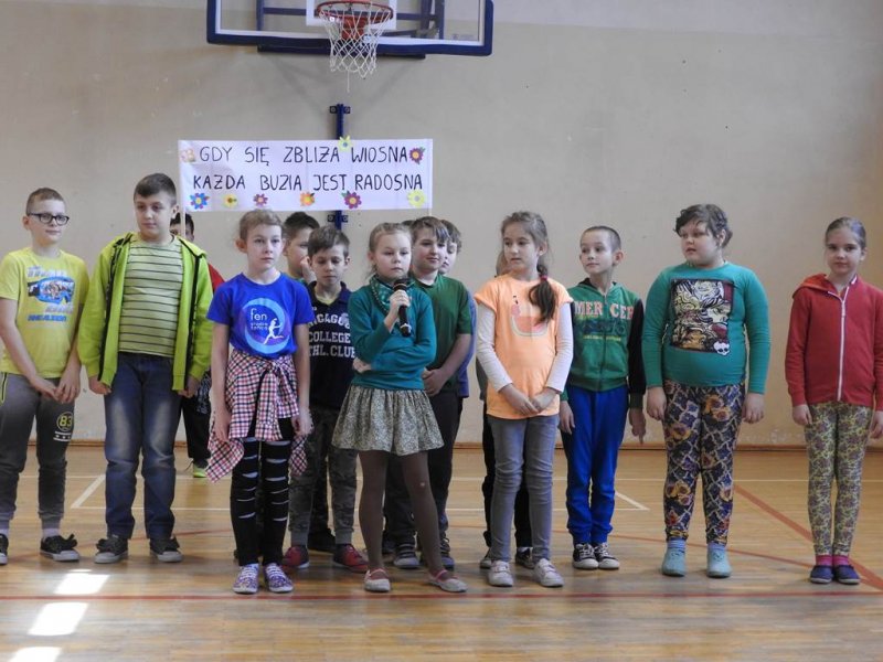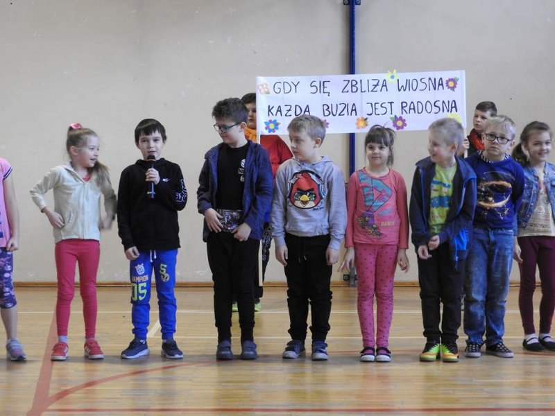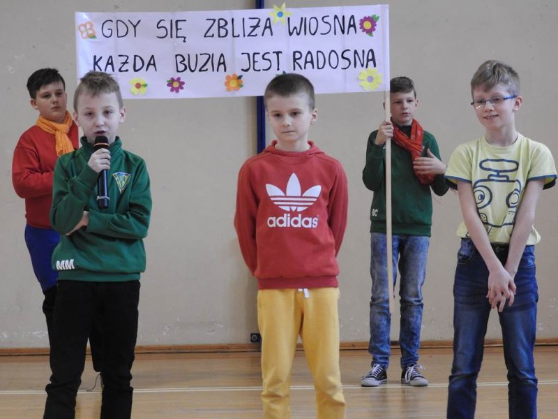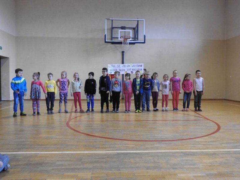 Pani dyrektor powitała uczniów i rodziców, przytoczyła przysłowia i zadała zagadki związane z tą porą roku. Dzieci z oddziału przedszkolnego wykonały piękną marzannę, a uczniowie klasy Va witały wiosnę transparentem z hasłem: „Gdy nadchodzi wiosna, każda buzia jest radosna!”. Było dużo radości, wierszy i piosenek, a zespół taneczny Studia Tańca Fen zaprezentował się w układzie tanecznym. Miejmy nadzieję, że wiosna z takim powitaniem szybko zawita do nas również w przyrodzie.