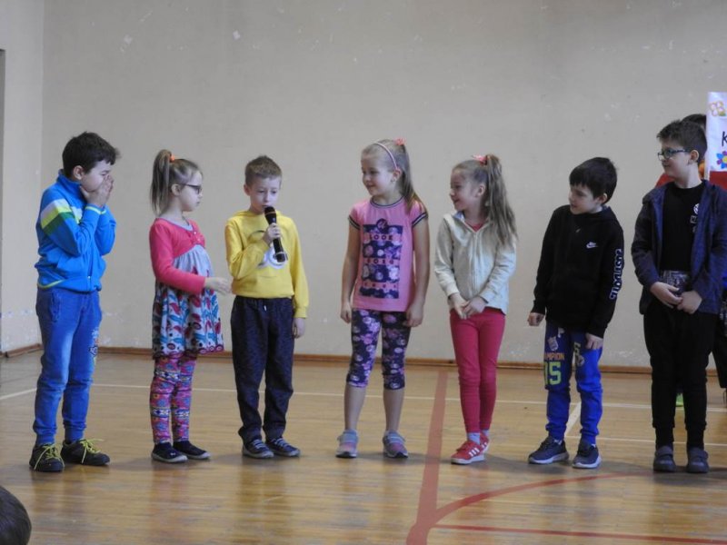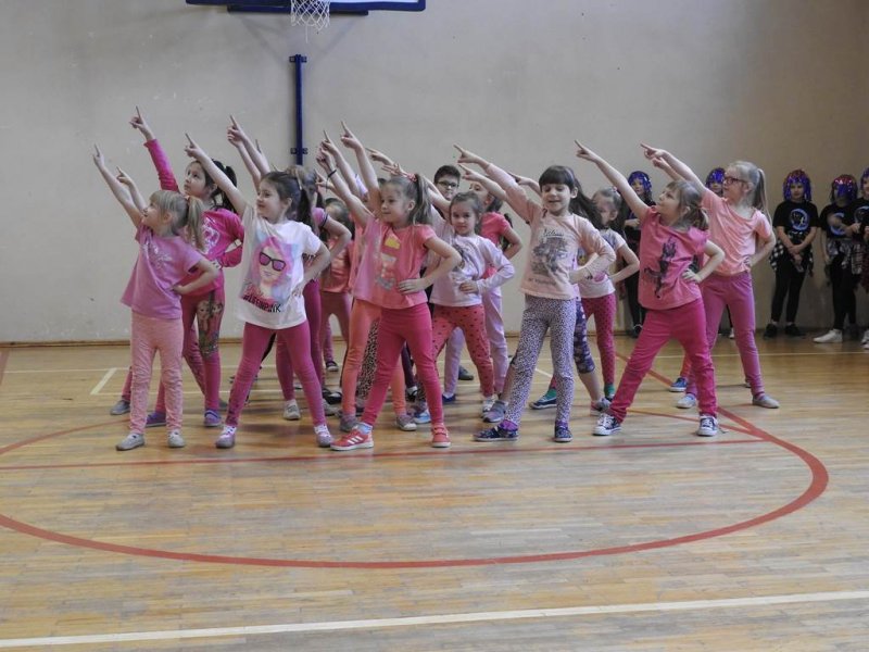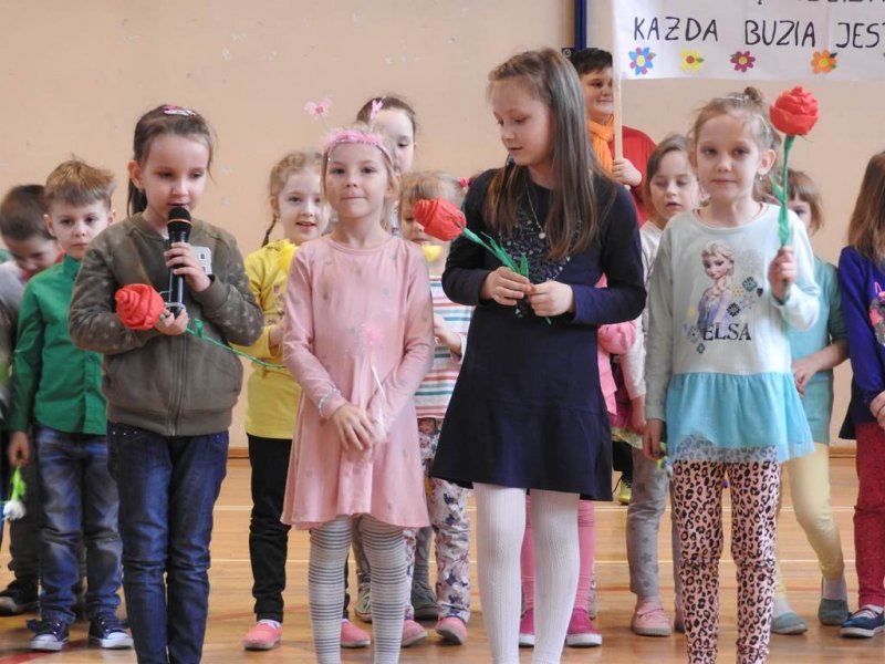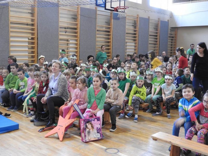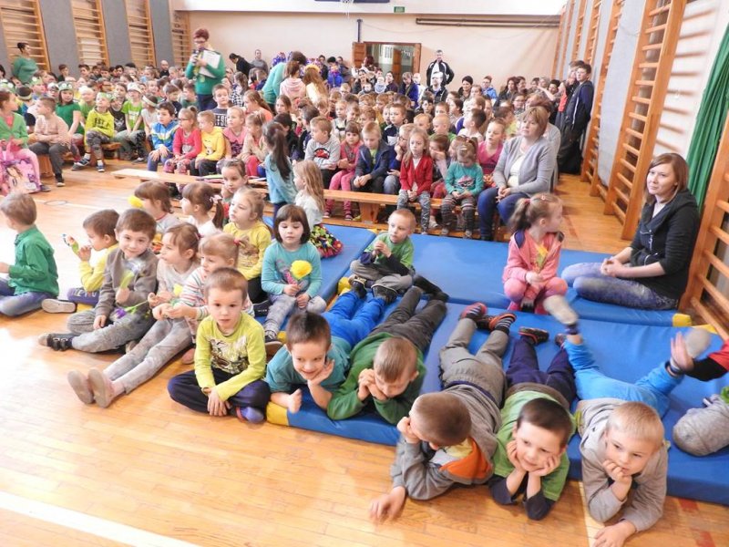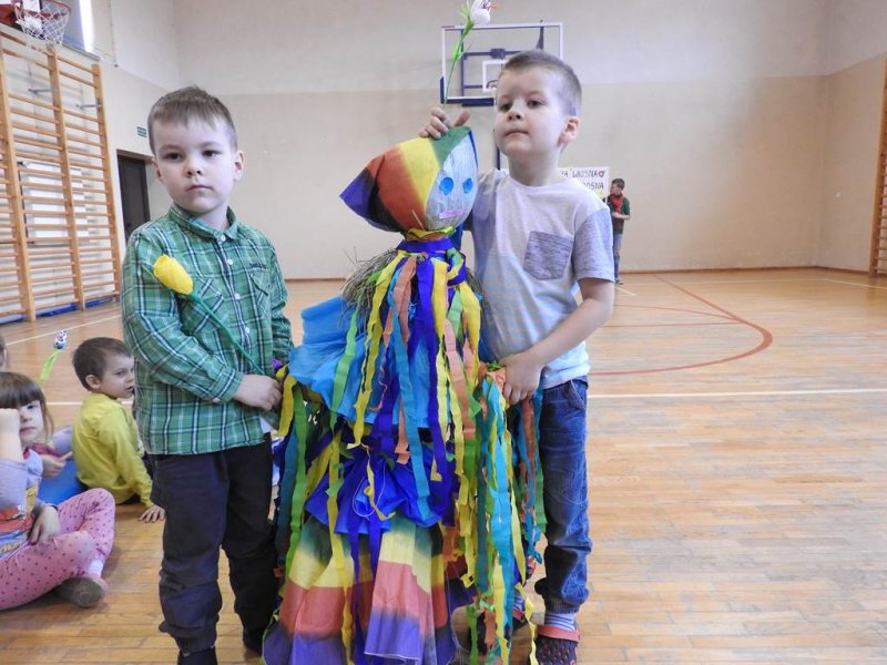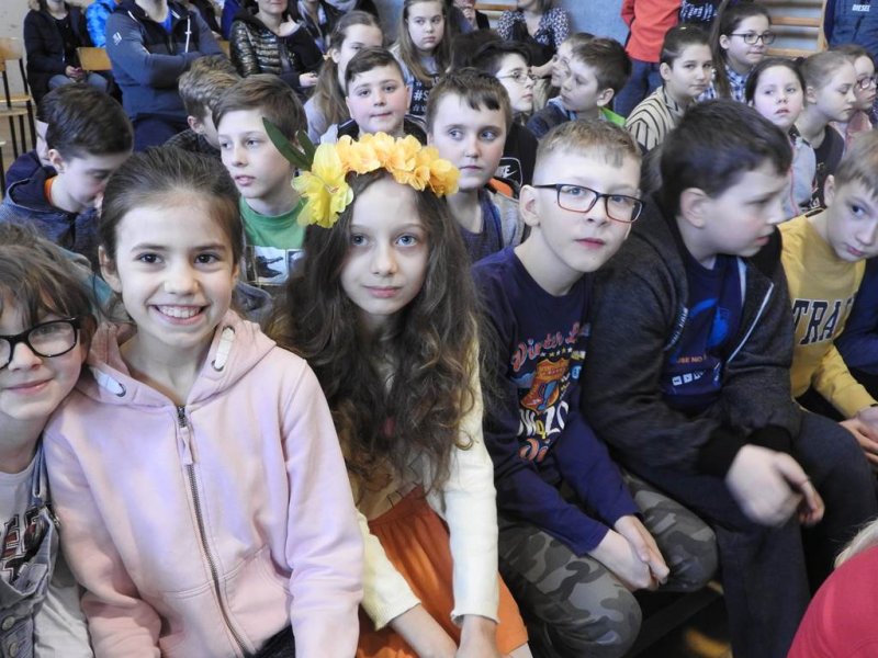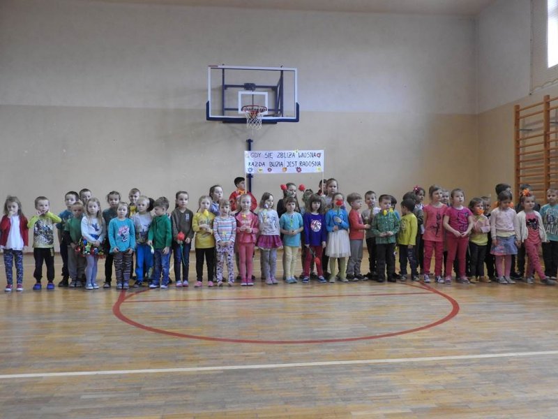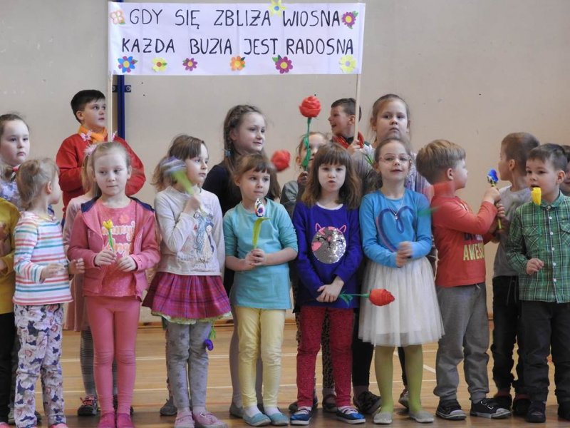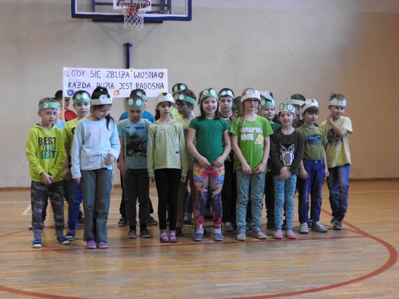 Pani dyrektor powitała uczniów i rodziców, przytoczyła przysłowia i zadała zagadki związane z tą porą roku. Dzieci z oddziału przedszkolnego wykonały piękną marzannę, a uczniowie klasy Va witały wiosnę transparentem z hasłem: „Gdy nadchodzi wiosna, każda buzia jest radosna!”. Było dużo radości, wierszy i piosenek, a zespół taneczny Studia Tańca Fen zaprezentował się w układzie tanecznym. Miejmy nadzieję, że wiosna z takim powitaniem szybko zawita do nas również w przyrodzie.