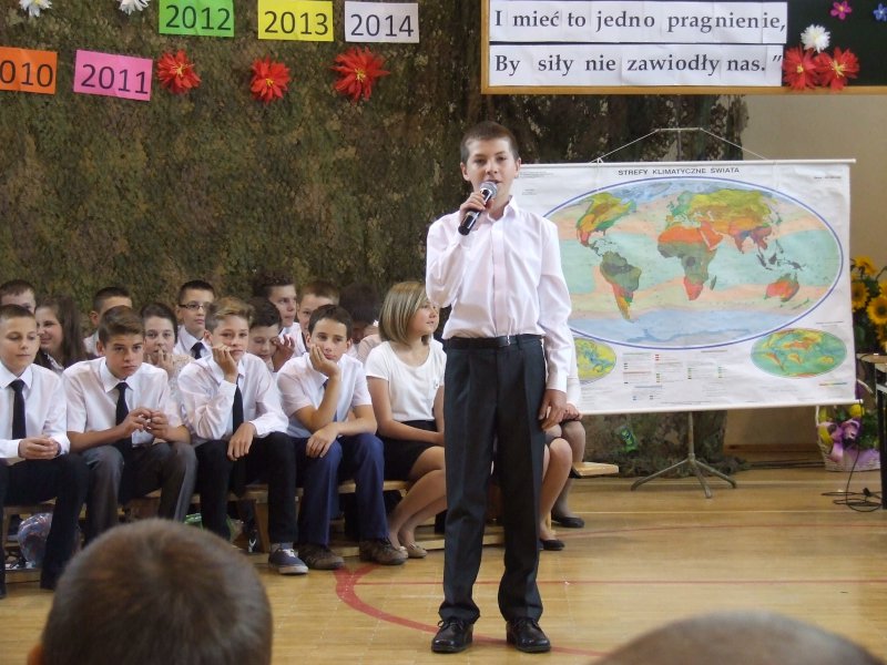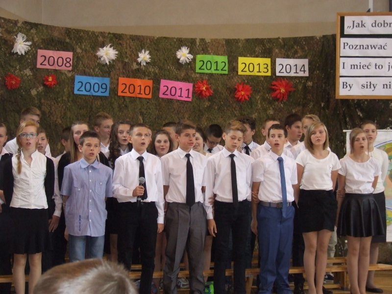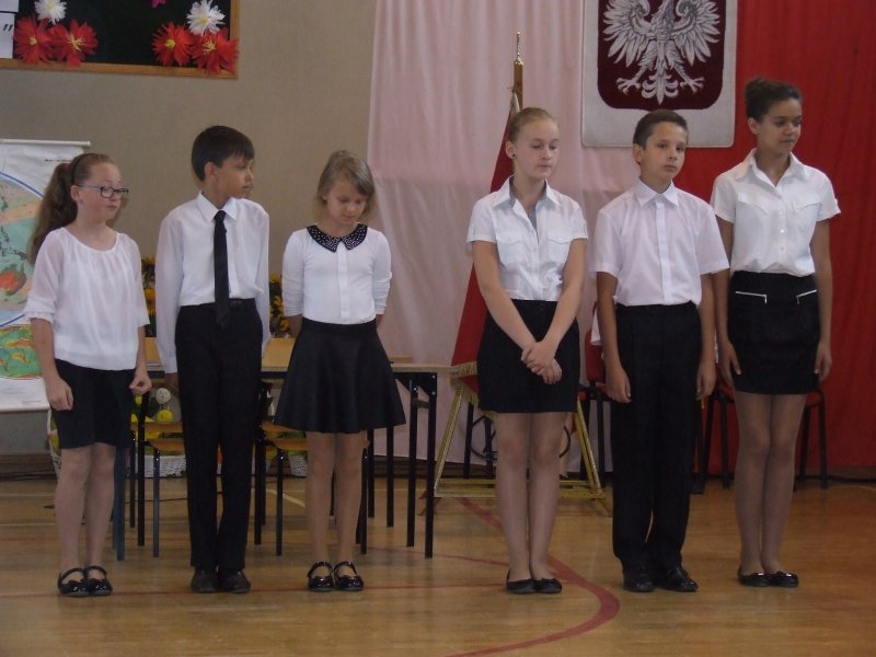 Po tej części przyszedł czas na występ uczniów klas VI. Absolwenci mogli powrócić do wspólnie spędzonych chwil i spojrzeć na siebie i rzeczywistość szkolną z przymrużeniem oka. Bardzo miłym i zabawnym akcentem, oprócz żartów szkolnych czy wierszyków, były utwory muzyczne wykonane indywidualnie i grupowo przez szóstoklasistów.