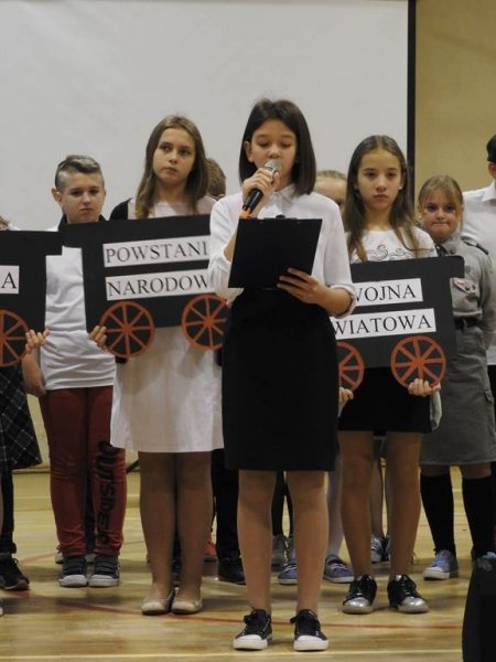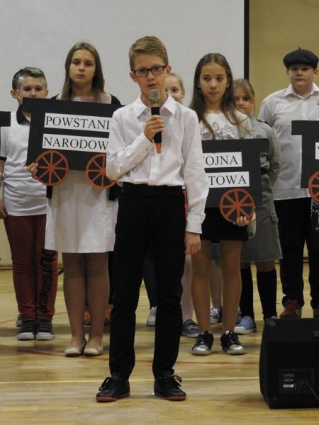 Po części oficjalnej rozpoczęły się występy artystyczne. Uczniowie zaprezentowali montaż słowno-muzyczny pt. „Pociąg do wolności”, który w bardzo ciekawy i obrazowy sposób przedstawił losy naszej Ojczyzny począwszy od zaborów, a skończywszy na roku 1918. Pociąg historii zatrzymywał się na stacjach: Niewola, Powstania narodowe, I wojna światowa, Wolność. Występ wzbogaciły pieśni patriotyczne, m.in. „Rota”, „Przybyli ułani”, „Piechota’, „Biały krzyż”.