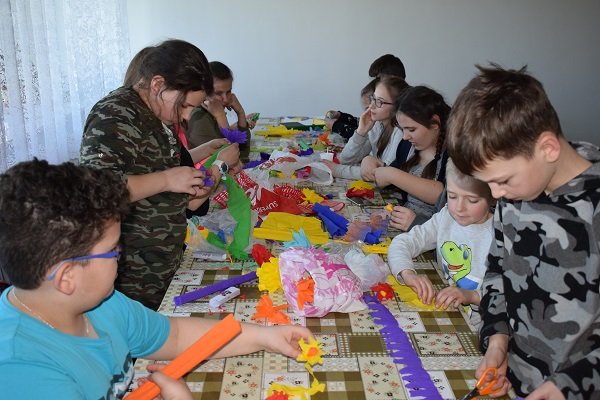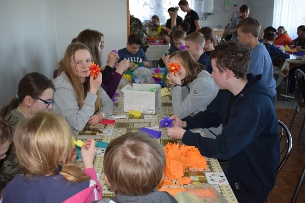Popołudnie harcerze spędzili na przygotowaniu wielkanocnej palmy – trzymetrowej długości, kolorowa niewątpliwie była ozdobą niedzielnej procesji. Miłą niespodzianką przyniósł sobotni wieczór, spędzony w miedzeńskim GOK-u, gdzie uczestniczyliśmy w niecodziennym widowisku przygotowanym przez młodzież z tamtejszego KSMu. Spektakl „Krew jego na nas” , wprowadził bardzo licznie zgromadzoną widownię w refleksję i świąteczny nastrój Niedzieli Palmowej i Świąt Wielkiej Nocy.