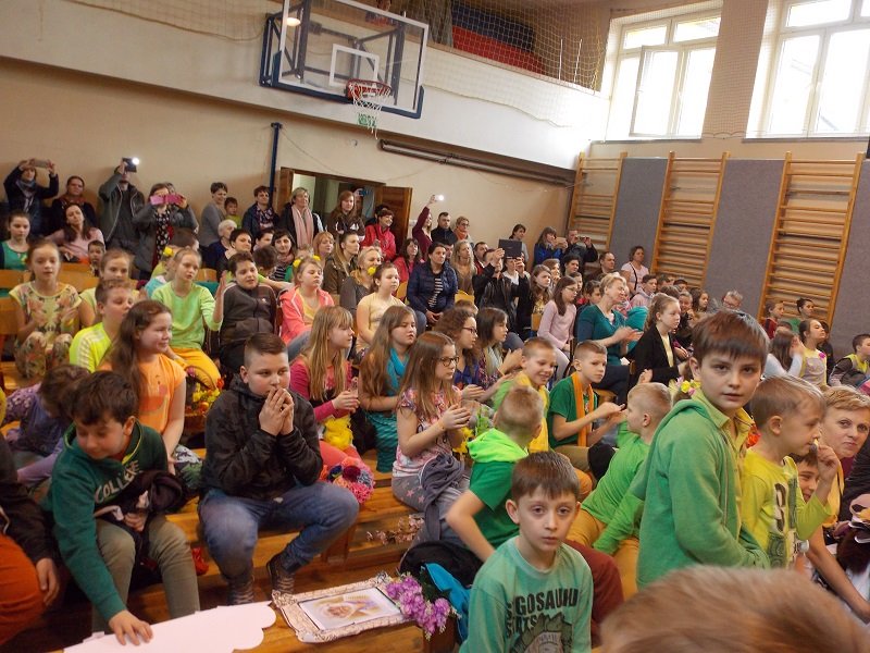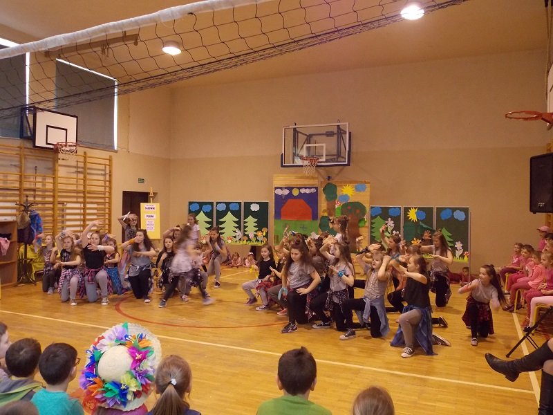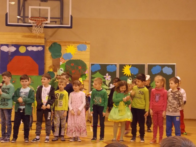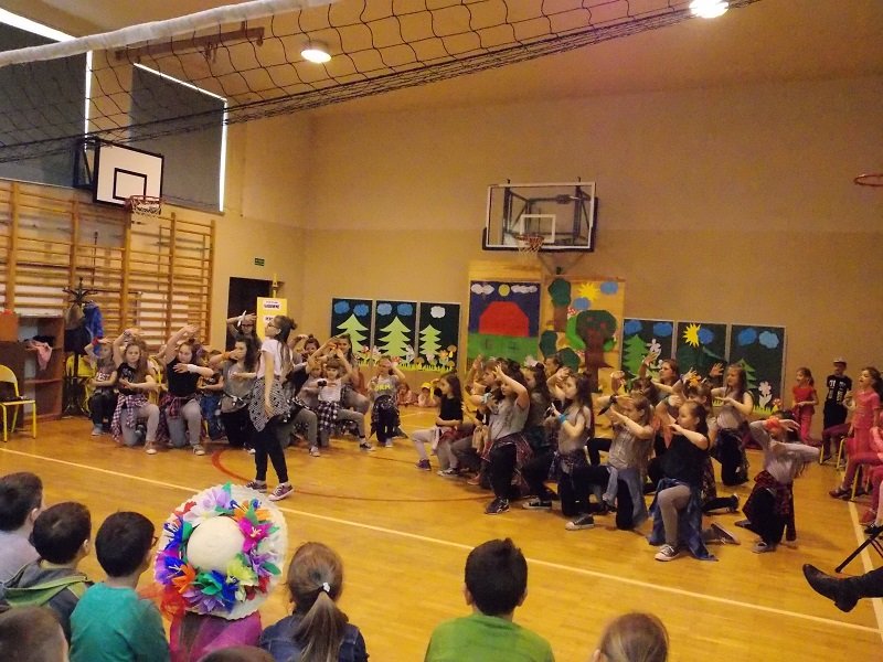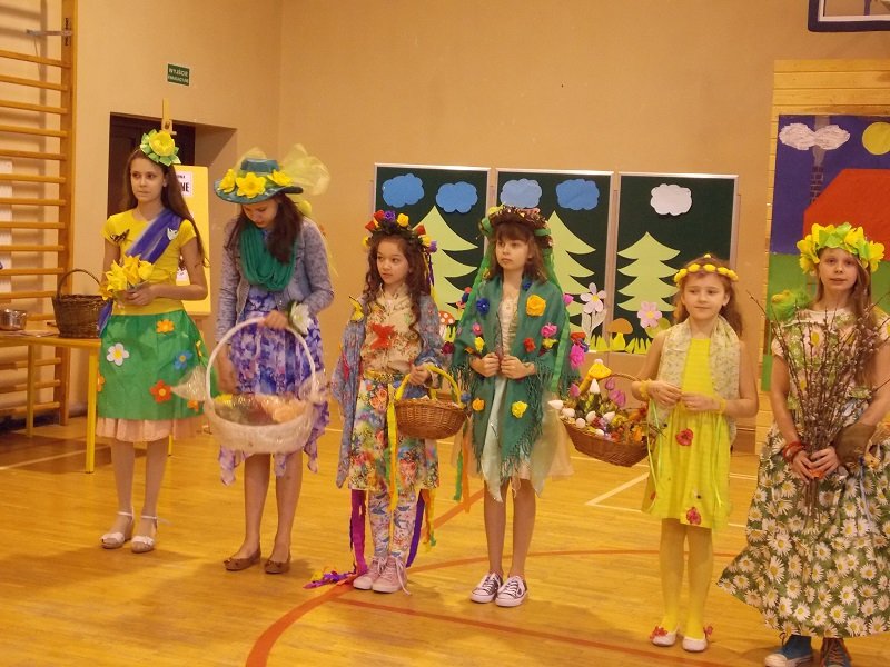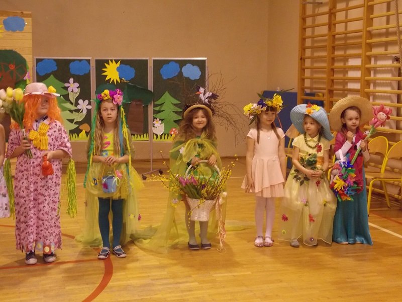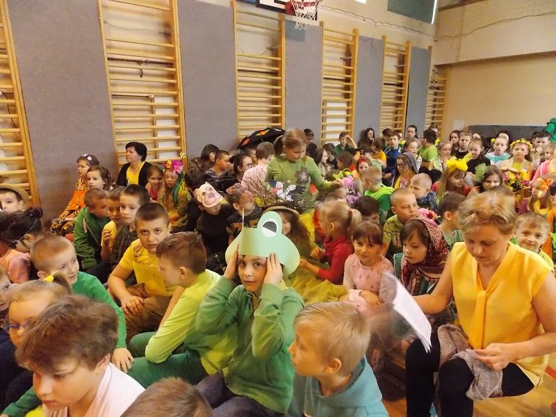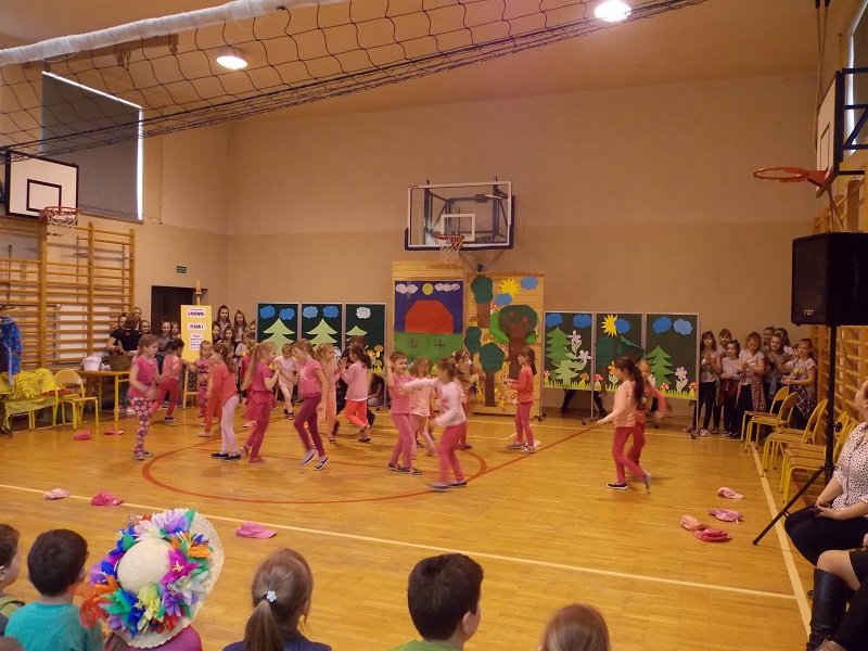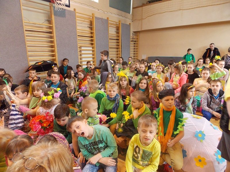 Z tej okazji każda klasa ubrana była w stroje w barwach wiosennych. Uczniowie prezentowali się fantastycznie! Każda klasa występowała na środku sali gimnastycznej deklamując i obrazując wiersze Juliana Tuwima, Jana Brzechwy min.: Rzepka, Lokomotywa, Żaba, Zosia Samosia, Okulary; oraz śpiewając piosenki o tematyce wiosennej i przedstawiając scenki humorystyczne. Każdy oddział miał też wytypowaną osobę do pokazu mody MISS WIOSNY 2017. I tu niespodzianka- jedną z przebranych osób był MISTER WIOSNY. Jurorzy wybrali najpiękniejszych, którzy zostali obdarowani drobnymi łakociami.