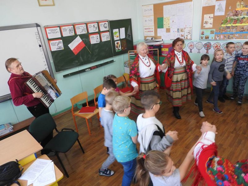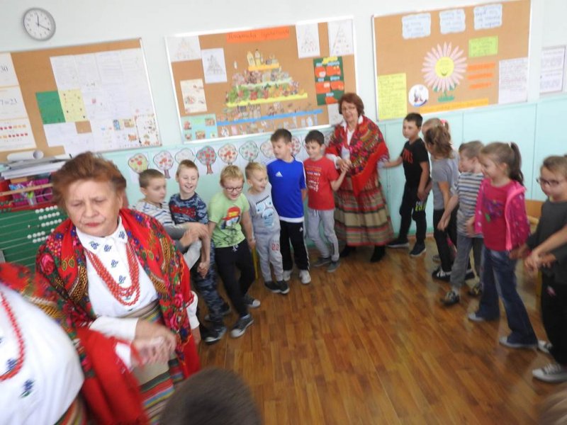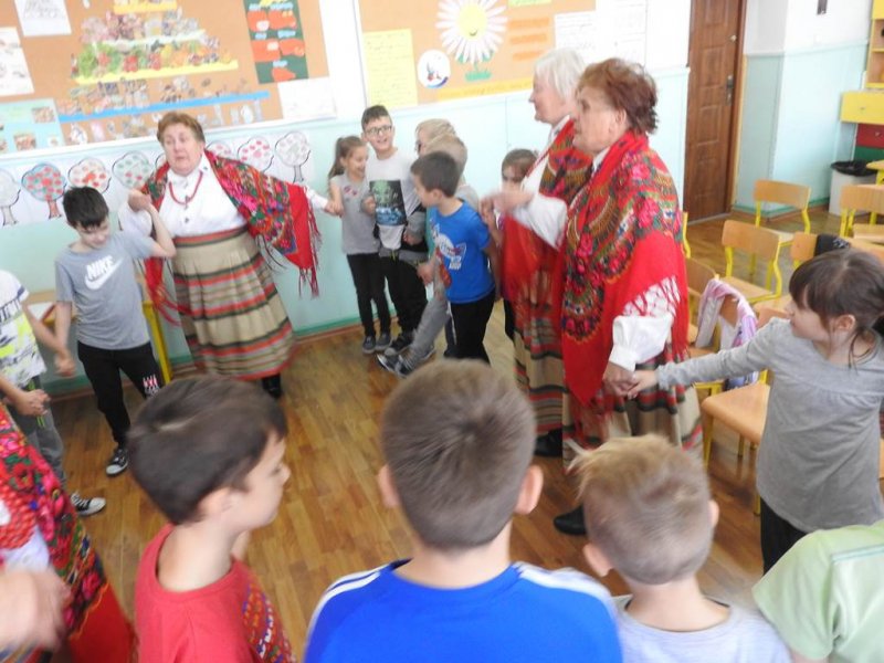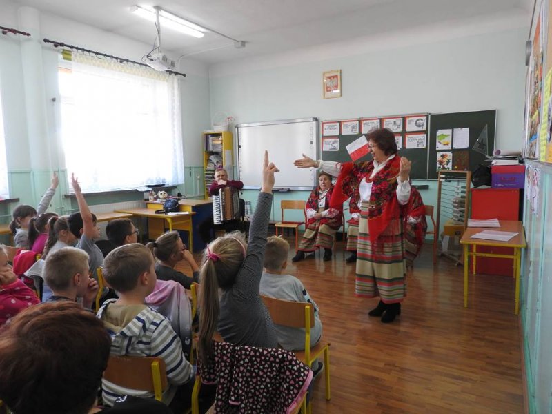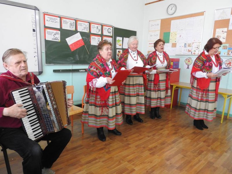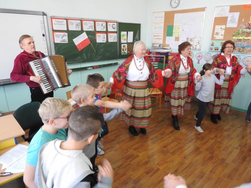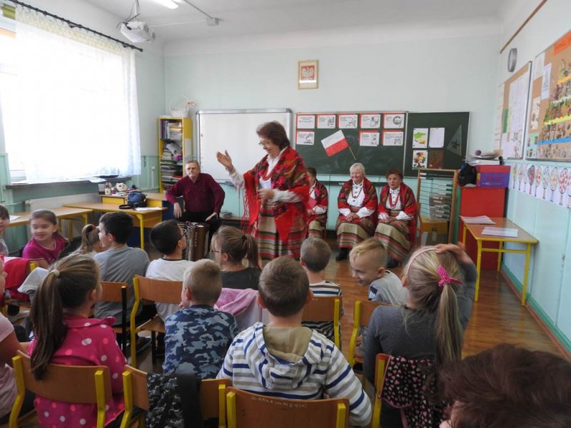 Pani Barbara recytowała wiersz ,,Stefek Burczymucha” Marii Konopnickiej, która tworzyła w okresie zaborów Polski ,,Ku pokrzepieniu serc…” dorosłych i dzieci.Dzieci podziwiały piękne stroje zespołu, które zostały opisane i zaprezentowane. Spotkanie zakończono wspólną zabawą w kółeczku przy walczyku ,,Jak długo na Wawelu”. Jesteśmy dumni z kultywowania tradycji przez zespół czekamy na następną taką żywą lekcję patriotyzmu.
