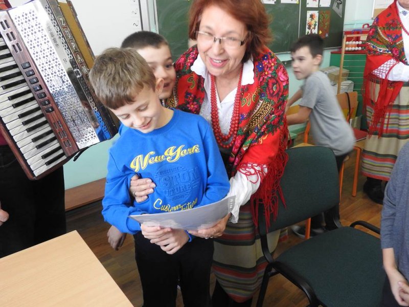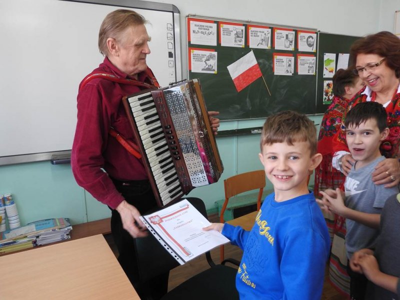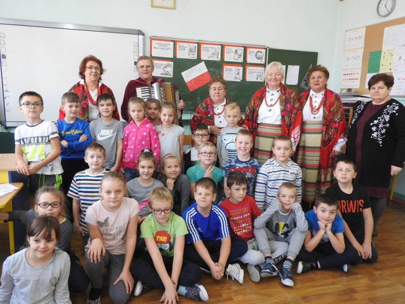 Z radością dzieci powitały brawami przedstawicieli zespołu ,,Sadowianki’’ : p. Barbarę Wróbel, p. Teresę Żach, p. Alicję Bachniuk, p. Henrykę Kibart i p. Andrzeja Oltona.Pani Barbara Wróbel rozmawiała z dziećmi o patriotyźmie, dzieci wspierały rozmowę przykładami.Zapoznała uczniów z historią powstania pieśni patriotycznych, które towarzyszyły naszym pradziadom w trudnych chwilach dla naszego państwa. Dzieci podawały przykłady, jak ważna jest niepodległość i suwerenność dla każdego nawet małego Polaka. Dzieci wraz z zespołem odśpiewały hymn narodowy,,Mazurek Dąbrowskiego”, ,,Rotę’’ Marii Konopnickiej.Następnie pieśni wojenne ,,Wojenko, wojenko”, ,,Przybyli ułani”. Pan Andrzej Olton (dziadek Wiktora-ucznia kl. II b) zapoznał uczniów z budową akordeonu. Dzieci zadawały wiele wnikliwych i szczegółowych pytań związanych z budową instrumentu, kosztem zakupu, jego wagą.