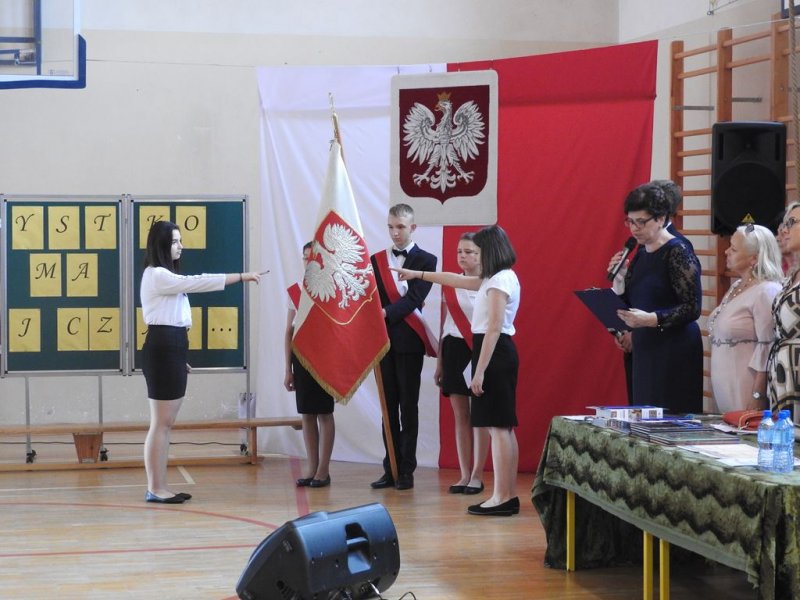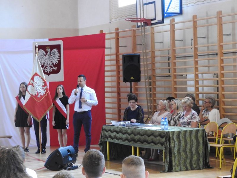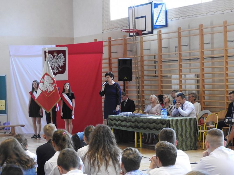 Na początku wszystkich zebranych na sali gimnastycznej (zaproszonych gości, nauczycieli, rodziców…) powitała p. dyr. Małgorzata Koroś. Wygłosiła też krótkie przemówienie adresowane do ósmoklasistów. Po niej głos zabrał p. Marcin Gręda- zastępca Wójta Gminy Sadowne.  Następnie odbyło się przekazanie sztandaru szkoły uczniom klas siódmych i ślubowanie przyszłych absolwentów.