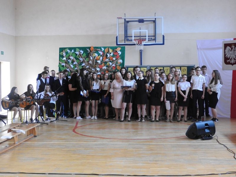 Na koniec części artystycznej wszyscy ósmoklasiści razem z wychowawczyniami- p. Izabelą Wrzosek (VIIIa) i p. Martą Kotowską (VIIIb)- zaśpiewali piosenkę, która wywołała wzruszenie wielu żegnających i żegnanych oraz dużo  łez- „Ostatni raz z moją klasą”…