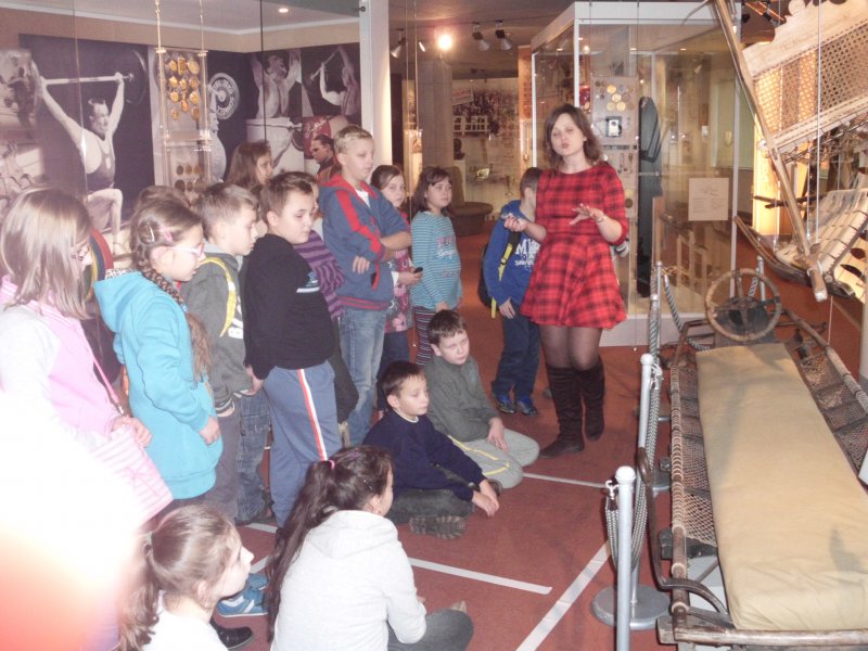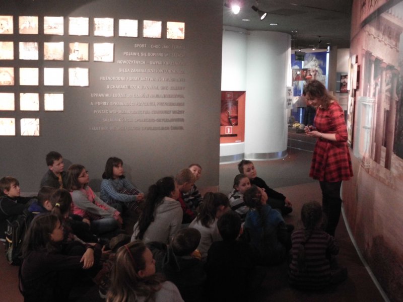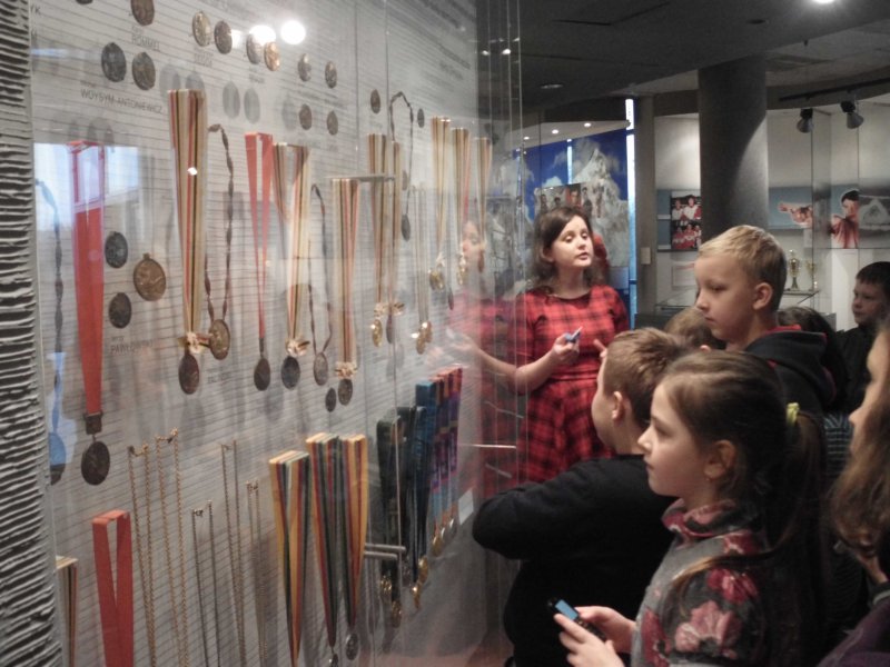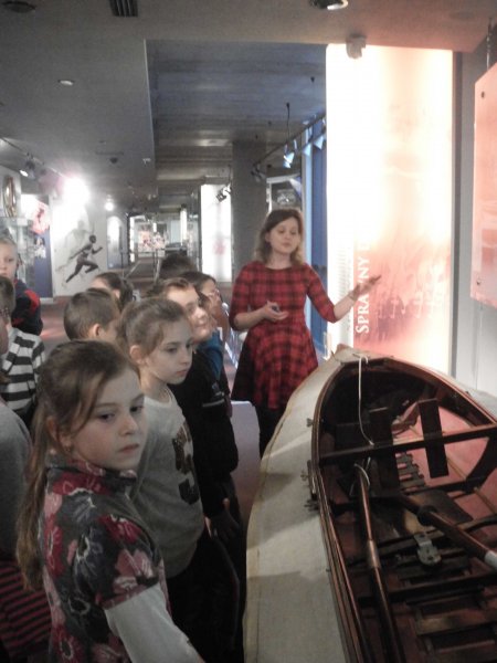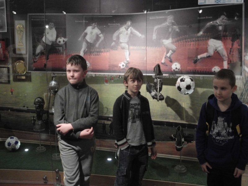 W Muzeum Sportu i Turystyki czekała na nas pani przewodnik, która zapoznała uczniów z historią igrzysk i symbolami olimpijskimi. Był czas na przybliżenie uczniom historii piłki nożnej i sylwetki najlepszych polskich piłkarzy oraz przedstawienie pozytywnego wzorca kibicowania.