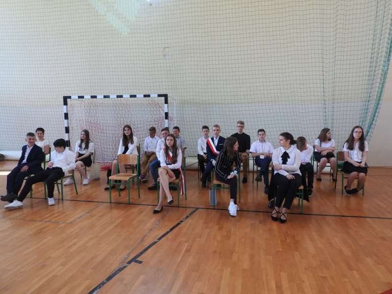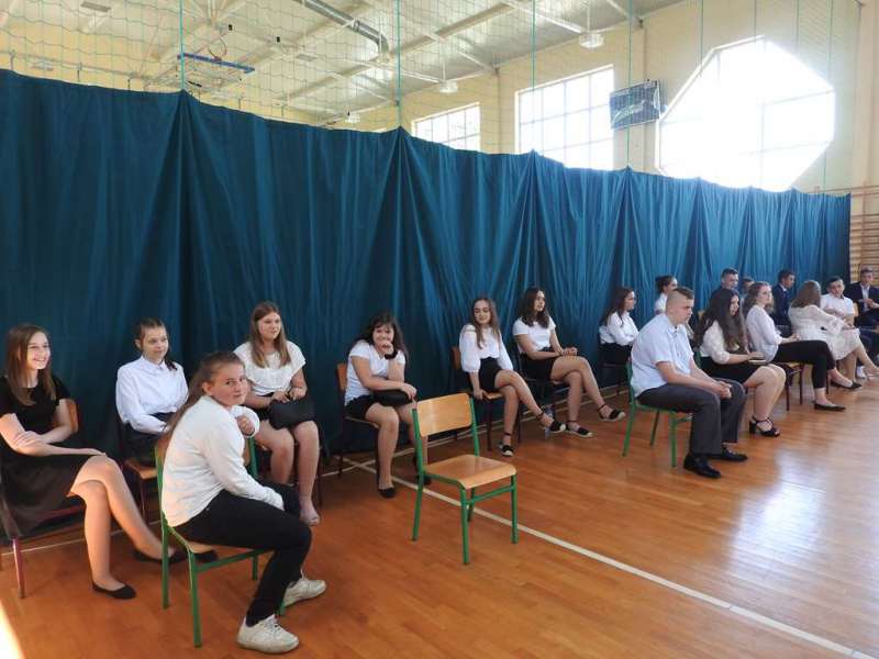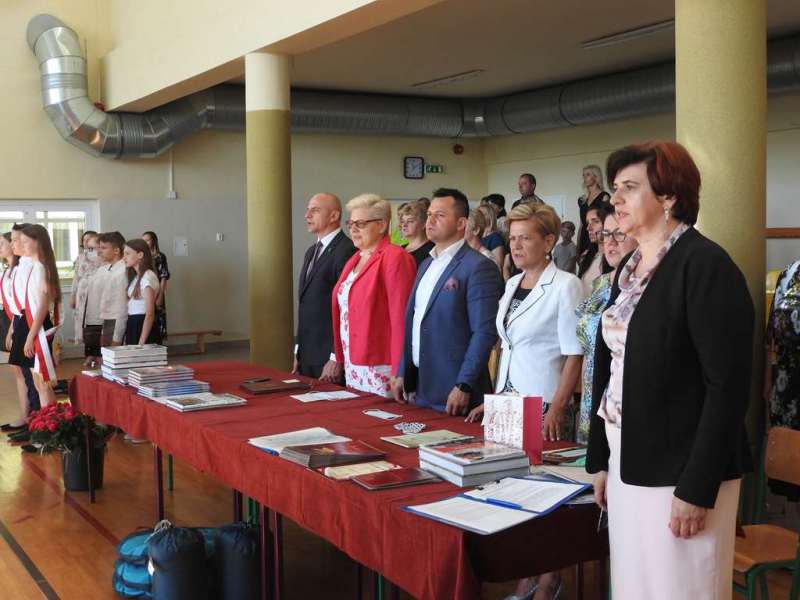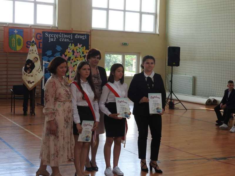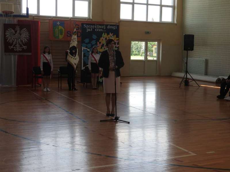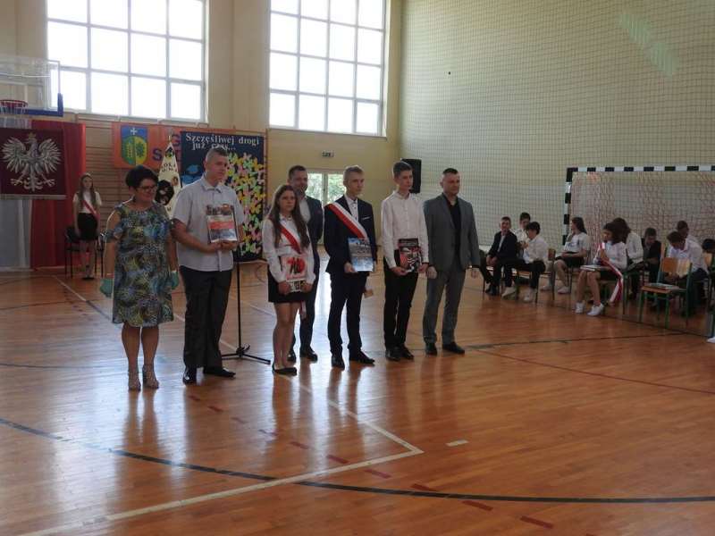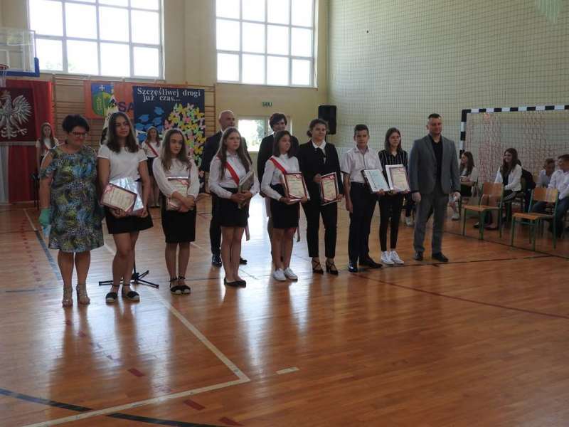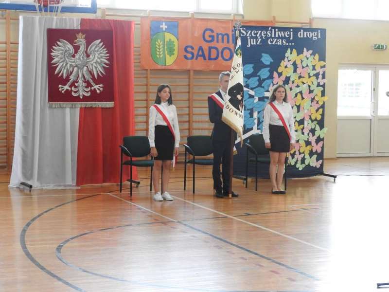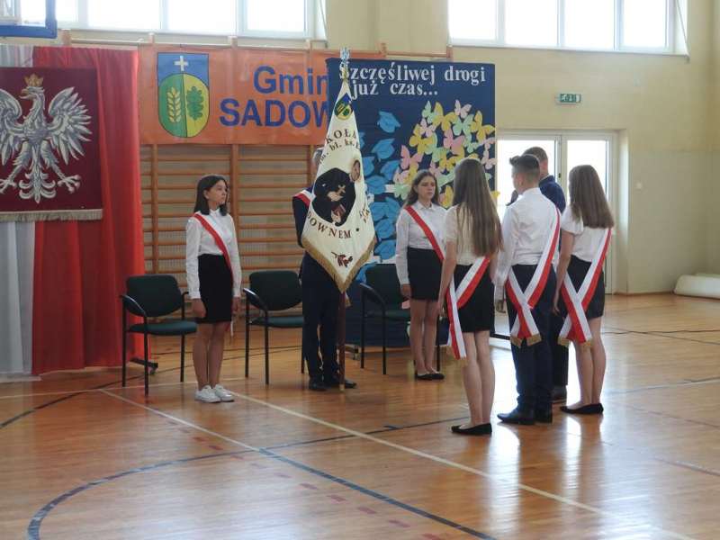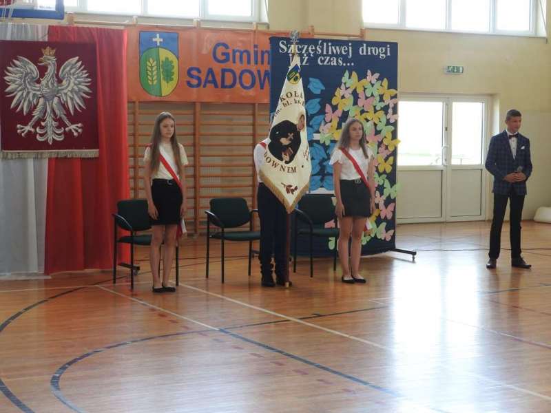 Nieco inny wymiar miało pożegnanie absolwentów naszej placówki. Na spotkanie to przybyli uczniowie z rodzicami, Rada Pedagogiczna, w tym wychowawcy: p. Urszula Kasiak i p. Arkadiusz Kotowski. Z zaproszenia skorzystali również Wójt Gminy Sadowne p. Waldemar Cyran, z-ca wójta p. Marcin Gręda oraz skarbnik gminy p. Anna Rukat. Po słowie wstępnym Pani dyrektor Małgorzaty Koroś, nastąpiło uroczyste przekazanie pocztu sztandarowego uczniom kl. VII. Uczniowie zgromadzeni w Gminnej Hali Sportowej odbierali gratulacje i podziękowania za efekty swej pracy na różnych płaszczyznach: dydaktycznej, kulturalnej, sportowej, artystycznej, wolontariackiej i społecznej. Na ręce rodziców wyróżnionych uczniów zostały złożone listy gratulacyjne. Uczniowie z najwyższymi wynikami w nauce i wzorowym zachowanie otrzymali liczne nagrody, w tym odebrali także Nagrody Wójta. Byli to: Izabela Ilczuk – średnia ocen 5,61, Zuzanna Gierej – 5,33, Wiktoria Decyk – 5,17. Bardzo wysokie noty otrzymali również: Maciej Ołdak – 5,11, Julia Kowalczyk – 5,06, Zuzanna Chądzyńska – 5,06, Paulina Jechna – 4,94. Czworo uczniów Krzysztof Dyoniziak, Izabela Ilczuk, Jan Rostek, Maksymilian Stobieniecki uzyskało 100% frekwencję. Wyjątkowym osiągnięciem mógł poszczycić się Maciej Ołdak- laureat Konkursu Historycznego na szczeblu województwa. Na zakończenie delegacja uczniów z klas siódmych, pożegnała starszych kolegów życzeniami i symbolicznymi upominkami. Mottem dla nich niech staną się słowa piosenki R. Rynkowskiego „Szczęśliwej drogi już czas”